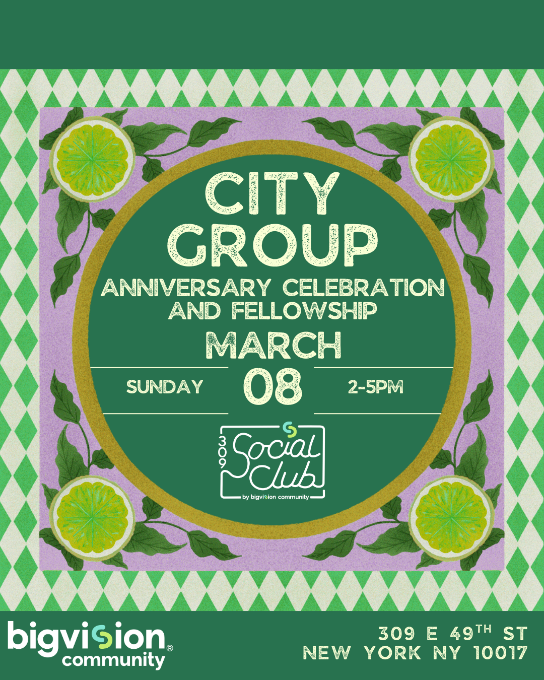 City Group Anniversary Celebration Sunday, March 8, 2026 2:00 PM 5:00 PM Bigvision Community 309 East 49th Street New York, NY, 10017 United States (map) Google Calendar ICS