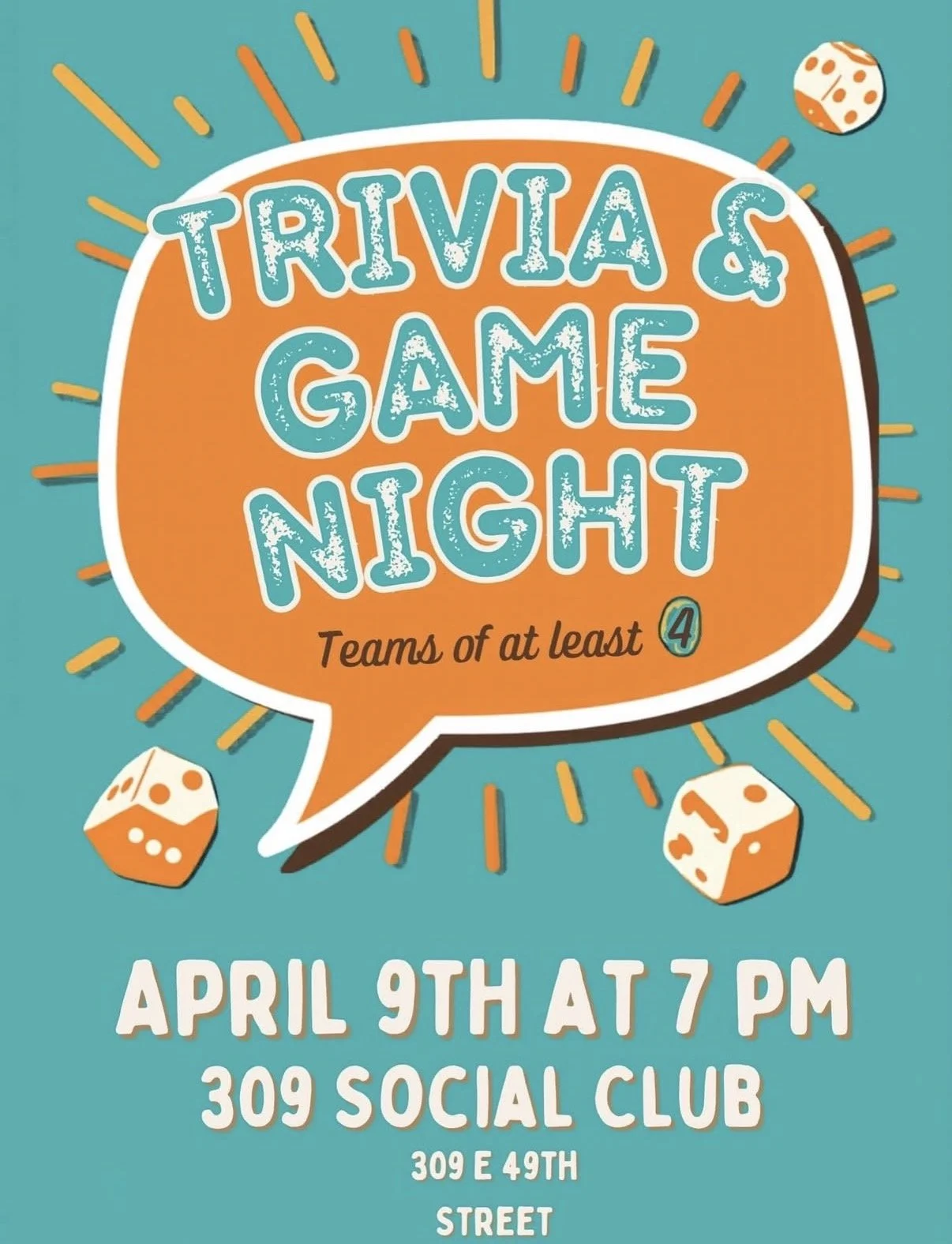 Join us for a Trivia & Board Game Night! Put your team of at least 4 together by April 8th, here are the sign ups: https://docs.google.com/spreadsheets/d/10ZcseDNG6V92_zsQNT2qYPRzB0jBG9a2Mz_Y2092V0g/edit?usp=drivesdk