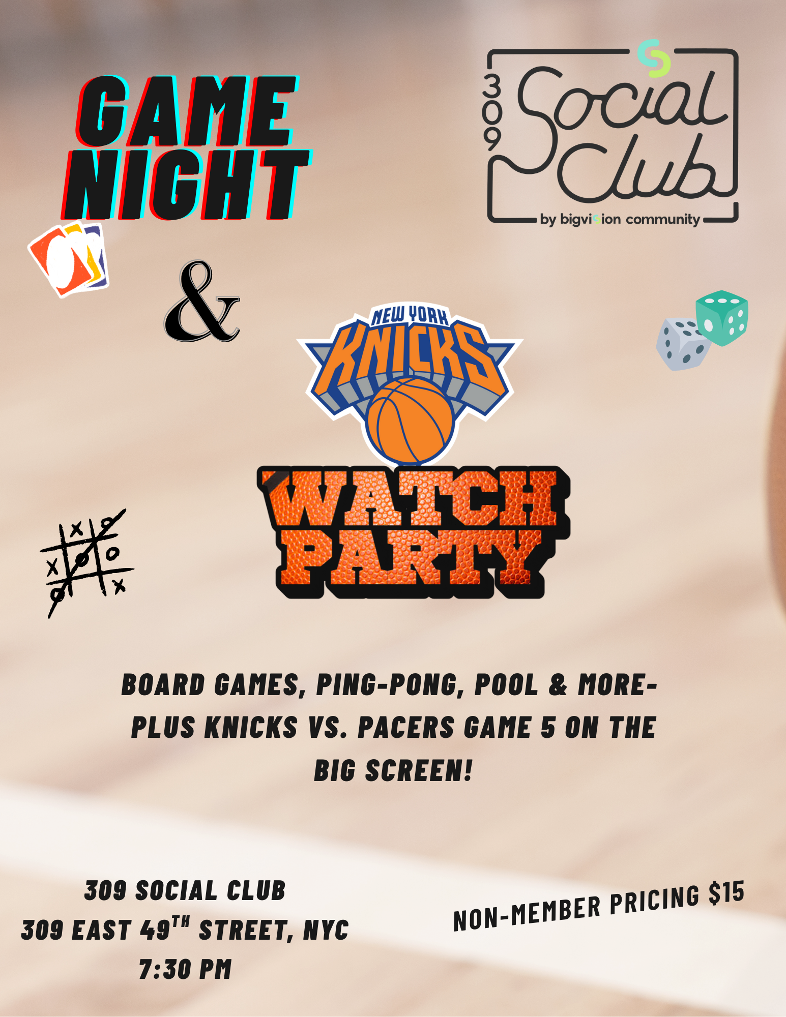 Game Night & Knicks Watch Party Thursday, May 29, 2025 7:30β―PM 10:30β―PM 309 Social Club 309 East 49th Street New York, NY, 10017 United States (map) Google Calendar ICS Non-Member Registration