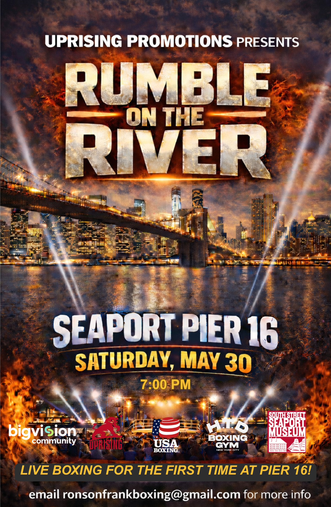 Rumble on the River is a first-of-its-kind, live outdoor boxing event taking over Seaport Pier 16, produced by Uprising Promotions in partnership with the South Street Seaport Museum, HTD Boxing Gym, Bigvision Community, and USA Boxing.